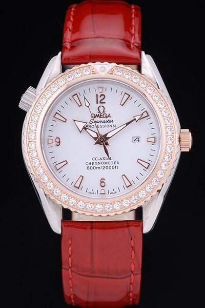 Crown: 18k rose-gold plated cutwork crown with Omega logo plus a polished stainless steel cutwork crown with logo on the opposite side