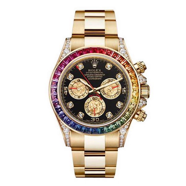 Watch bezel: Rainbow color diamonds inlaying and 18ct gold plated stainless steel bezel